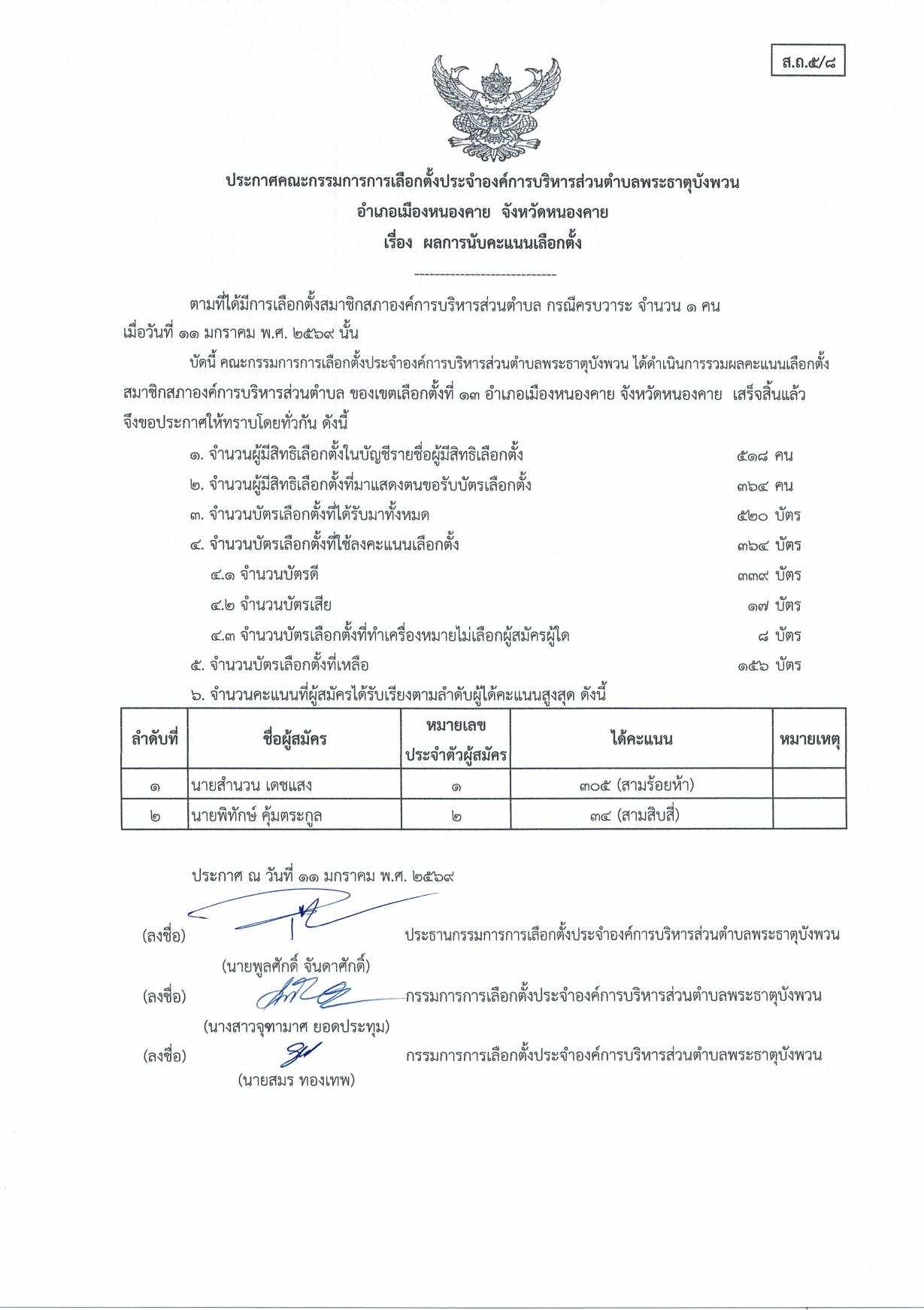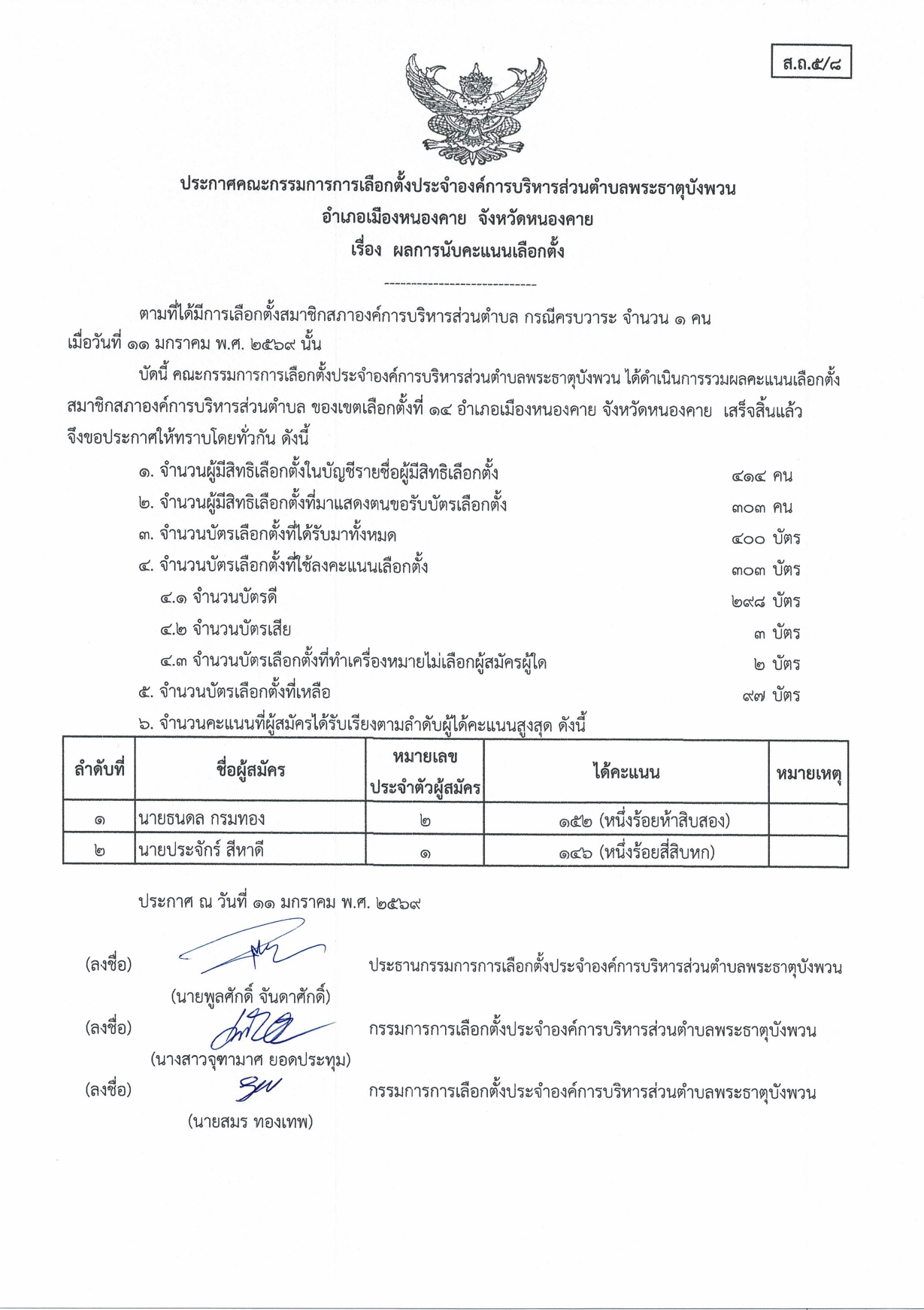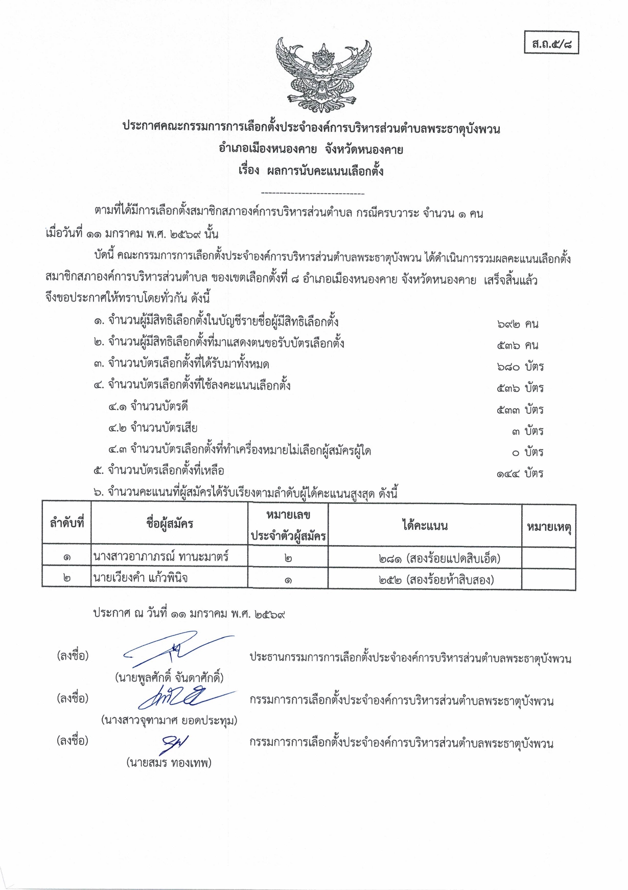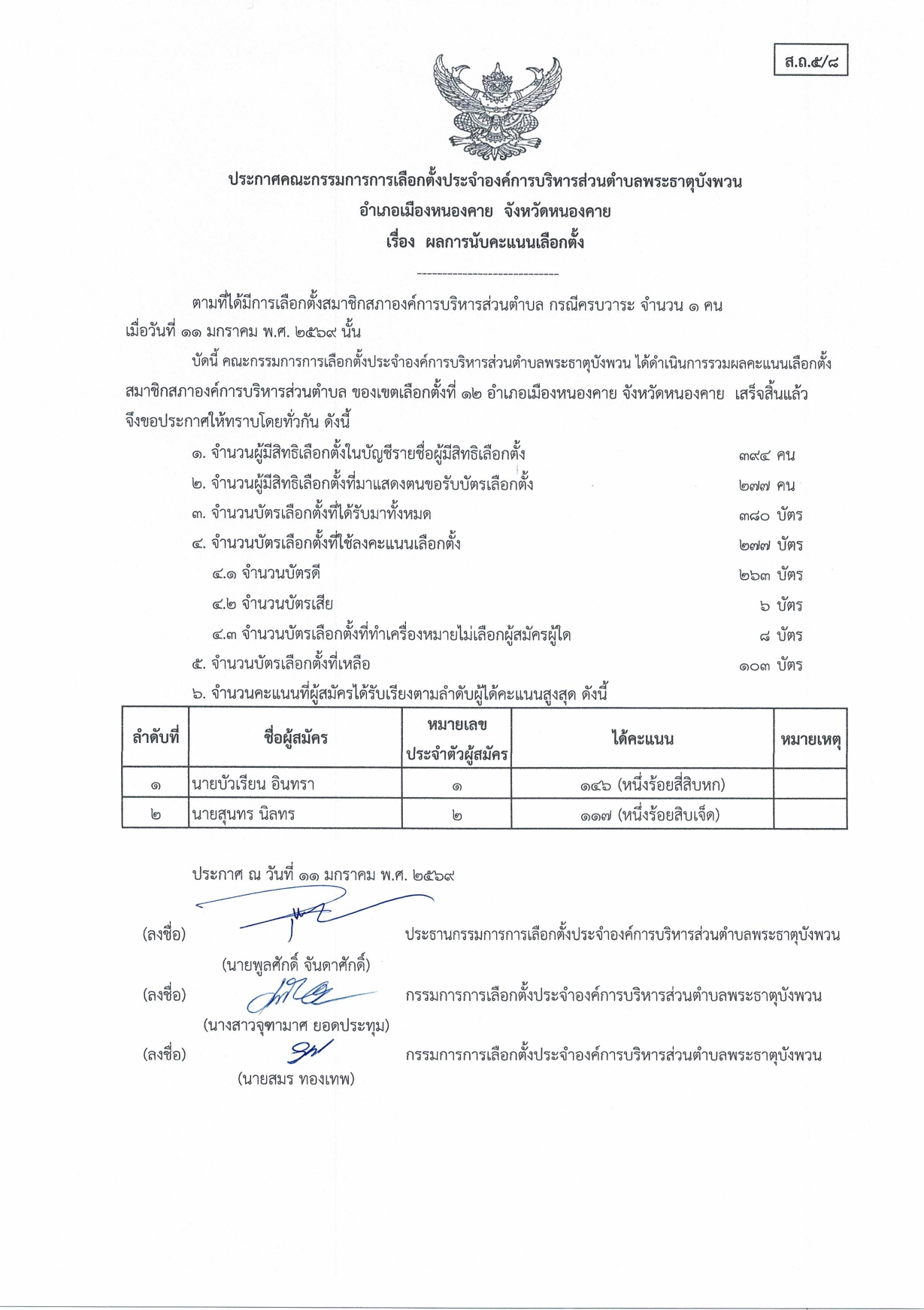 ประกาศคณะกรรมการการเลือกตั้งประจำองค์การบริหารส่วนตำบลพระธาตุบังพวน อำเภอเมืองหนองคาย จังหวัดหนองคาย เรื่อง ผลการนับคะแนนเลือกตั้ง