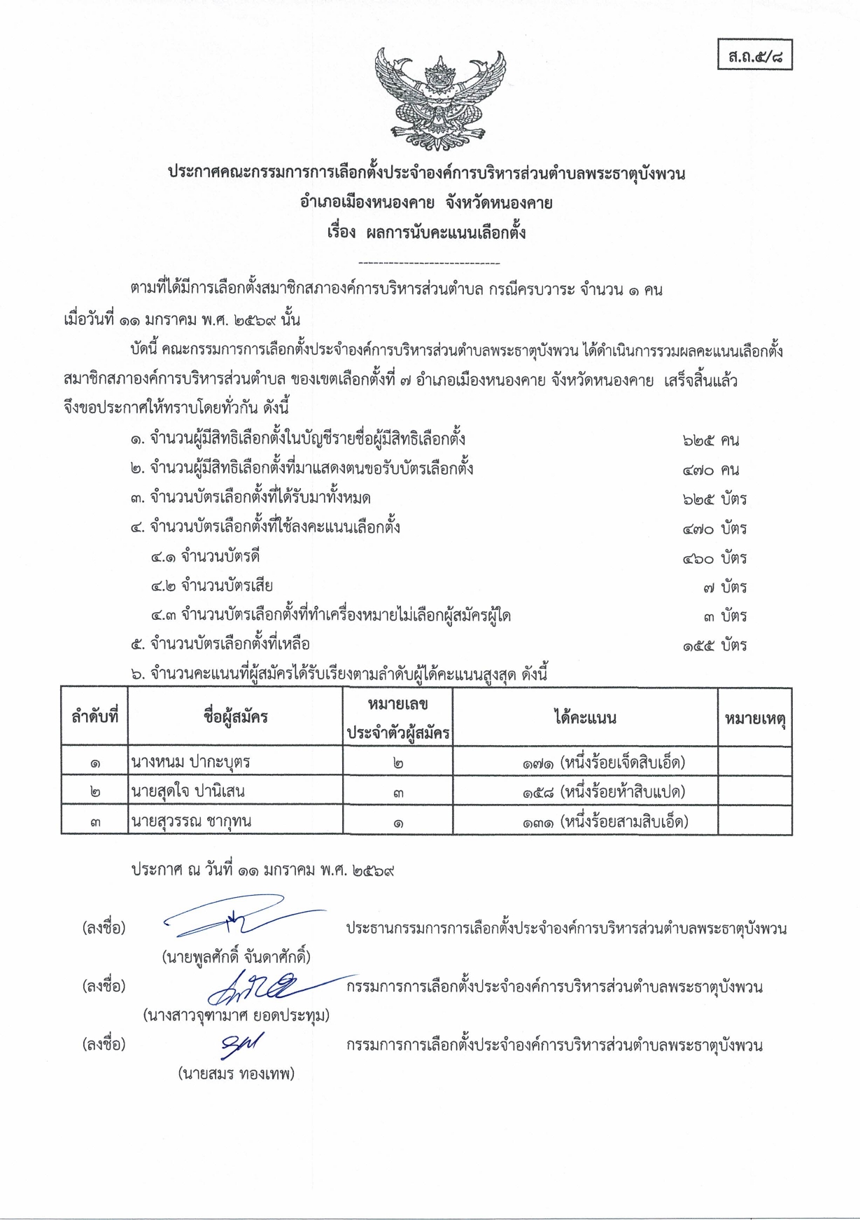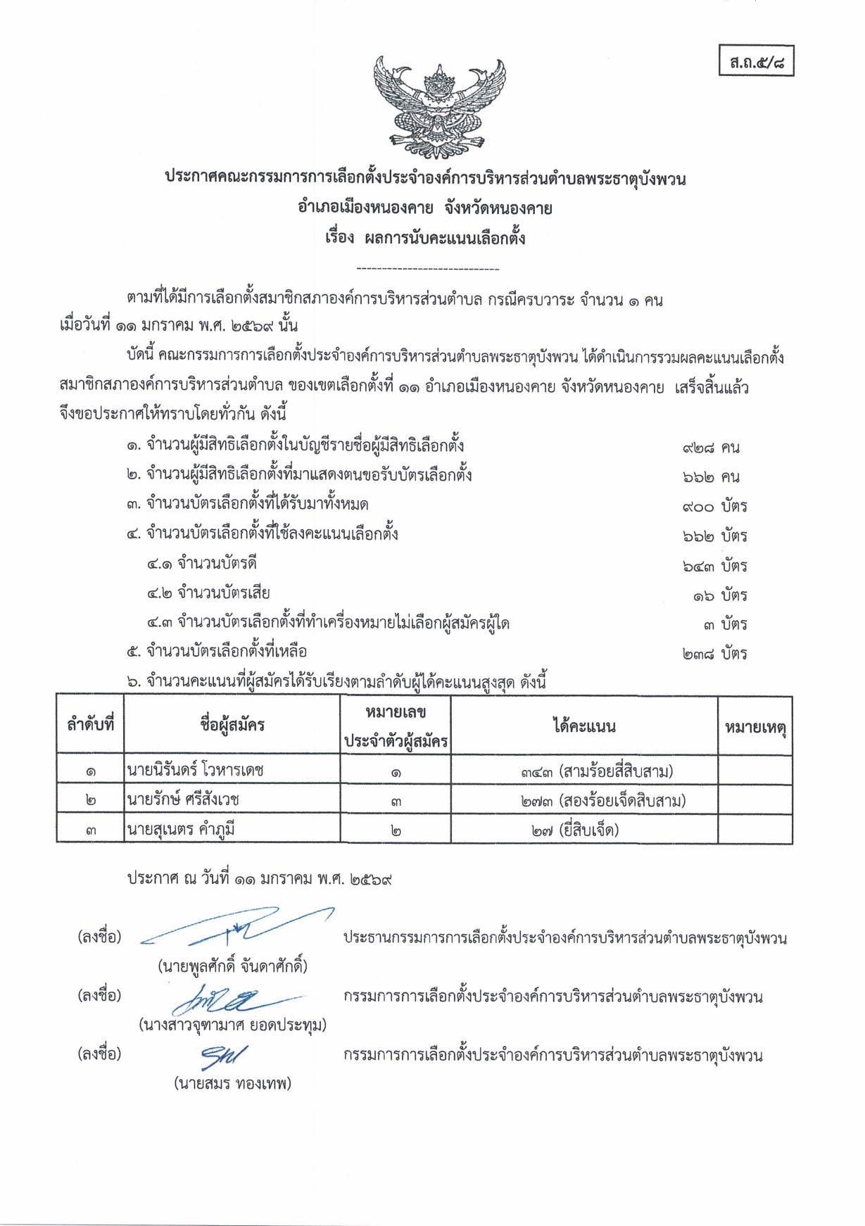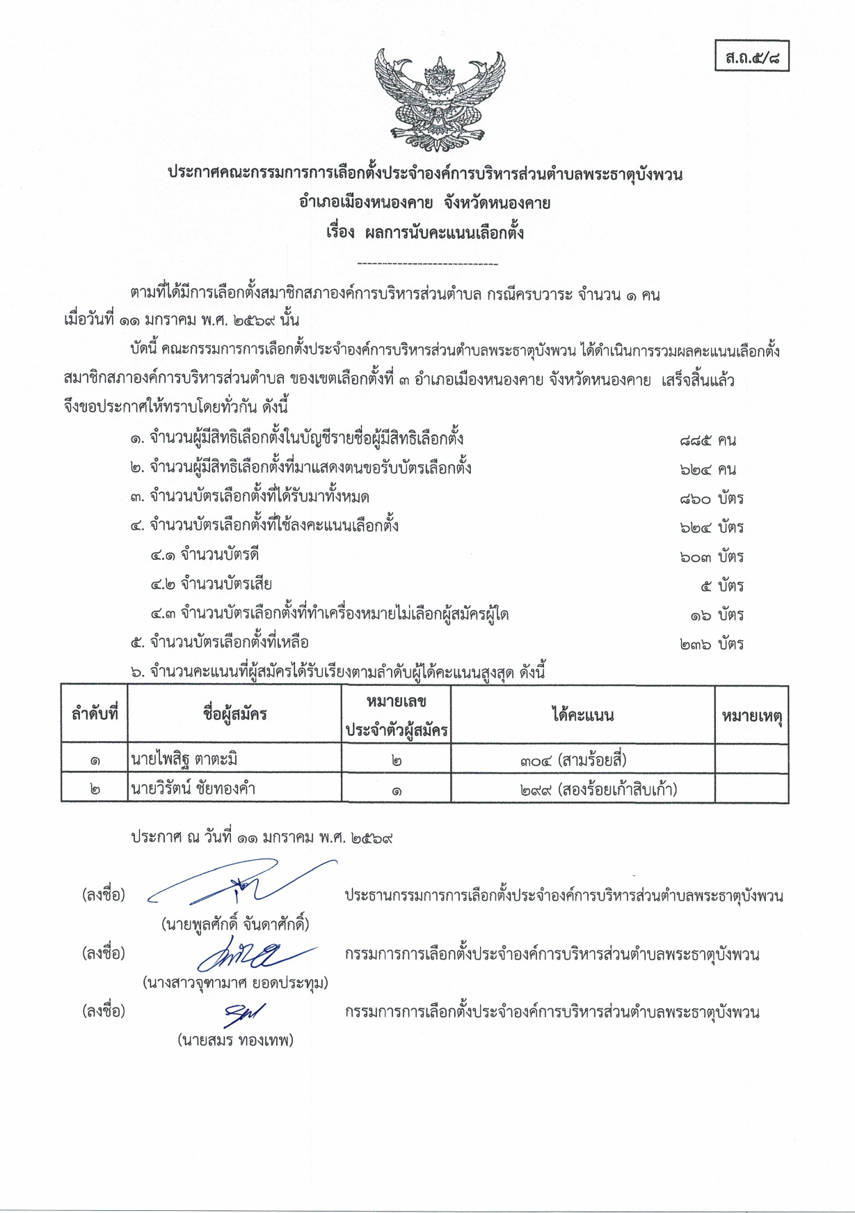 ประกาศคณะกรรมการการเลือกตั้งประจำองค์การบริหารส่วนตำบลพระธาตุบังพวน อำเภอเมืองหนองคาย จังหวัดหนองคาย เรื่อง ผลการนับคะแนนเลือกตั้ง