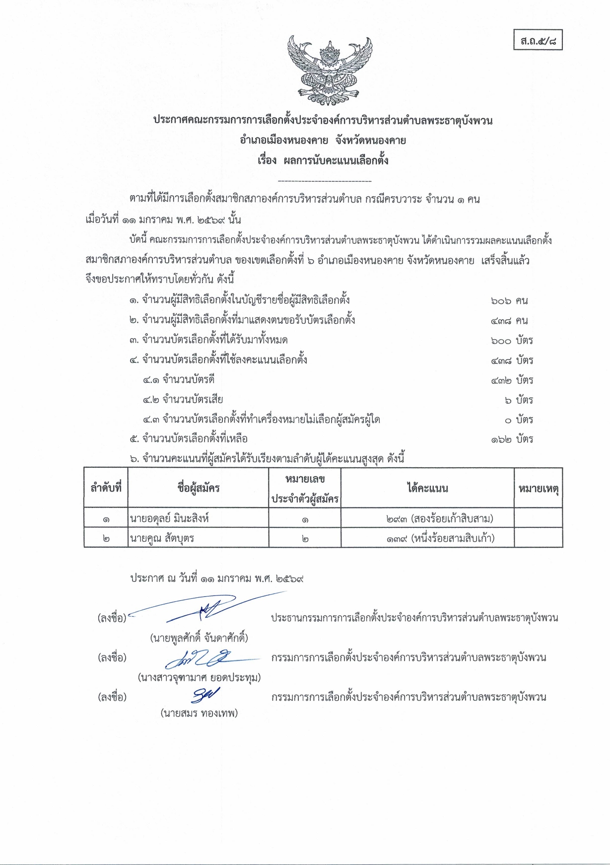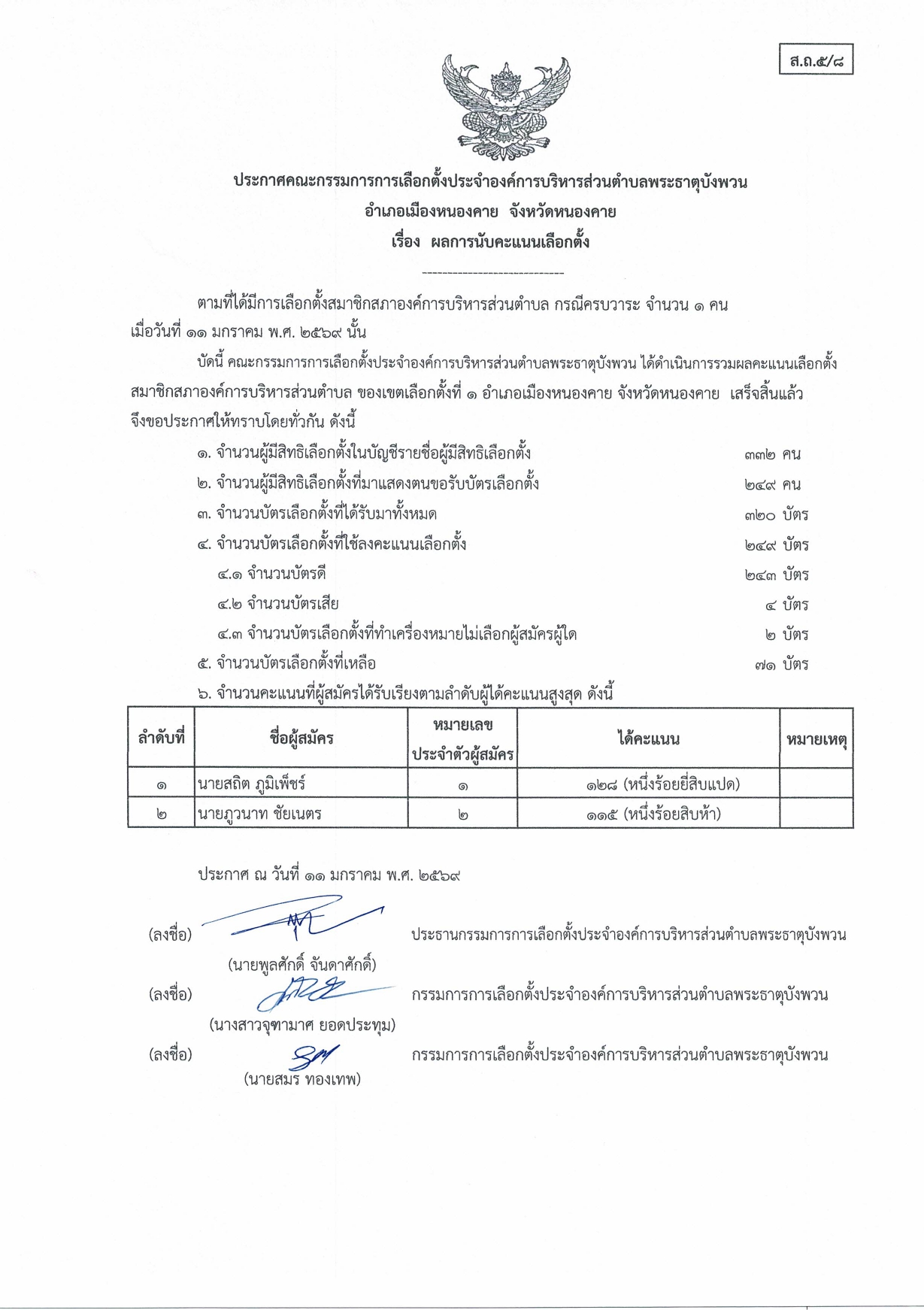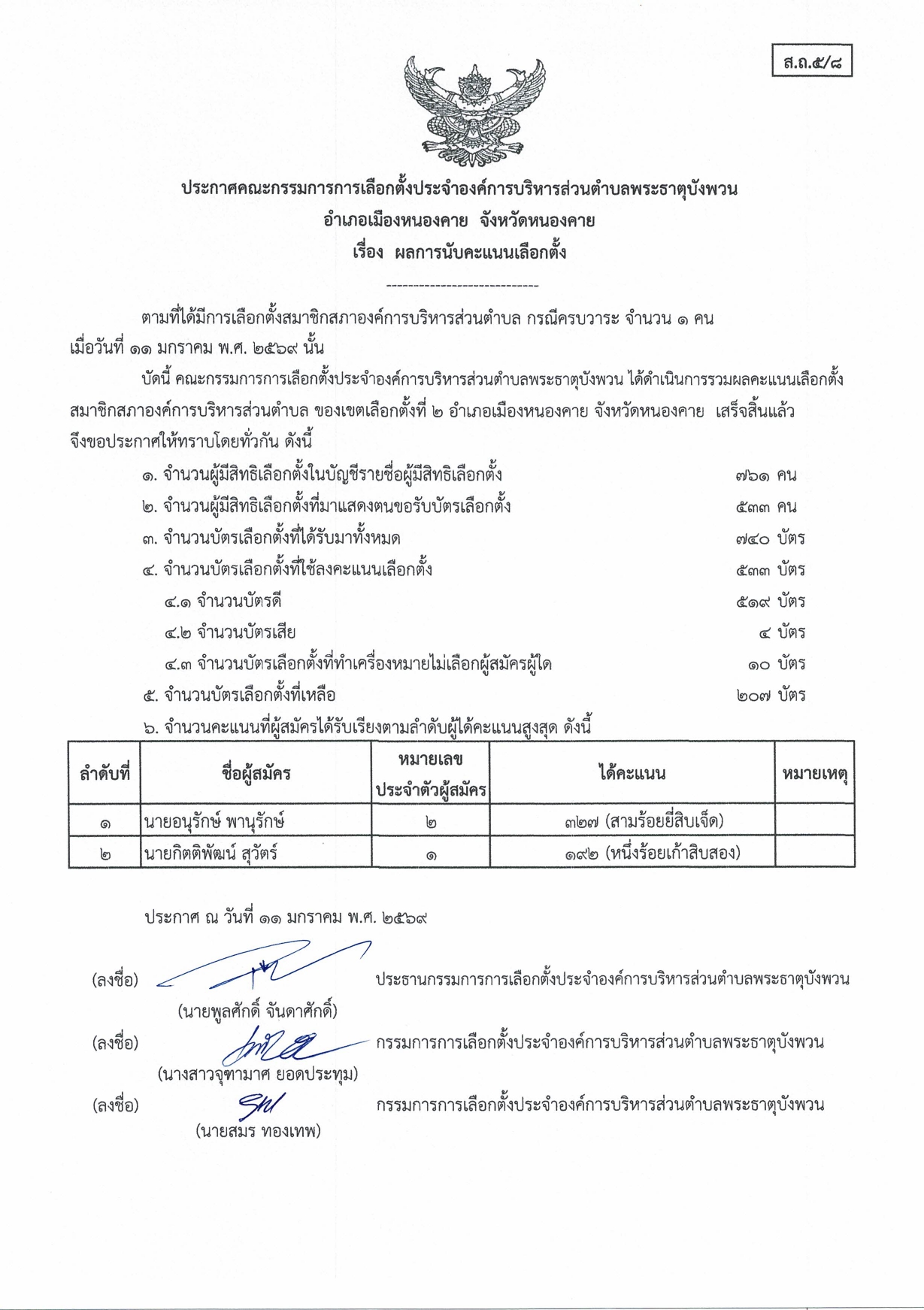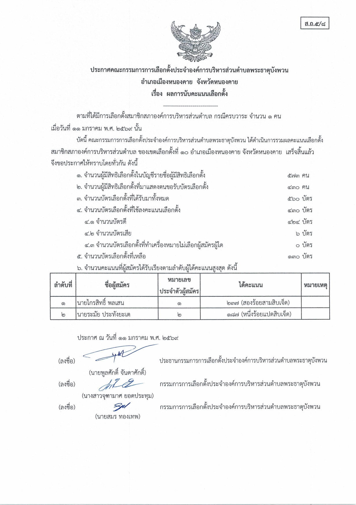 ประกาศคณะกรรมการการเลือกตั้งประจำองค์การบริหารส่วนตำบลพระธาตุบังพวน อำเภอเมืองหนองคาย จังหวัดหนองคาย เรื่อง ผลการนับคะแนนเลือกตั้ง