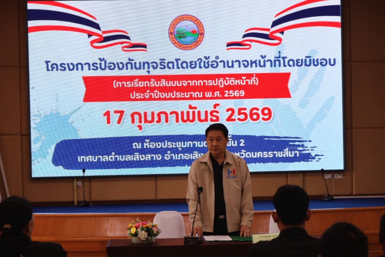 นางสาวสุวรรณ คูประทุมศิริ นายกเทศมนตรีตำบลเสิงสาง มอบหมาย นายจุมพล คูประทุมศิริ รองนายกเทศมนตรีตำบลเสิงสาง เป็นประธานเปิดการฝึกอบรมโครงการป้องกันทุจริตโดยใช้อำนาจหน้าที่มิชอบ (การเรียกรับสินบนจากการปฏิบัติหน้าที่) เทศบาลตำบลเสิงสาง ประจำปีงบประมาณ พ.ศ.2569 โดยมีคณะผู้บริหาร สมาชิกสภาเทศบาลฯ ข้าราชการ พนักงานและลูกจ้างเทศบาลตำบลเสิงสาง ผู้นำชุมชน คณะกรรมการชุมชน เข้าร่วมอบรมจำนวน 100 คน เพื่อให้ความรู้และปลูกจิตสำนึกของบุคลากรภายในเทศบาล และส่งเสริมการมีส่วนร่วมจากบุคลากรภายนอก และหน่วยงานในพื้นที่ โดยได้รับความอนุเคราะห์วิทยากรจาก สำนักงานคณะกรรมการป้องกันและปราบปรามทุจริตแห่งชาติ ประจำจังหวัดนครราชสีมา ณ ห้องประชุมทานตะวัน สำนักงานเทศบาลตำบลเสิงสาง